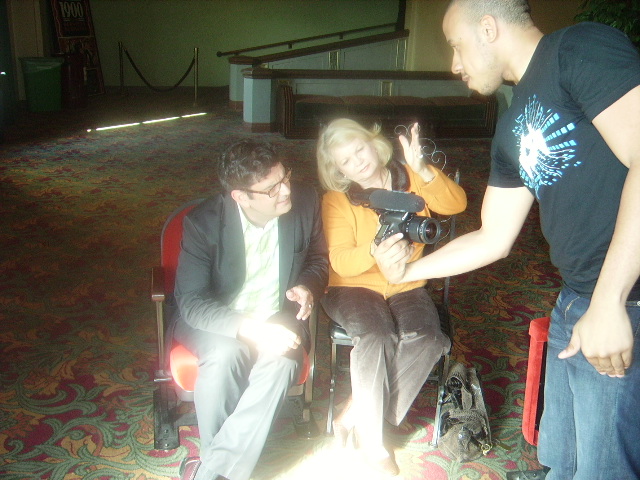 Kathy with Barry and Cameraman Frank setting up at the Castro Theater in San Francisco to tape a new Backstage with Barry and Kathy episode - The Bad Seed with Patty McCormack